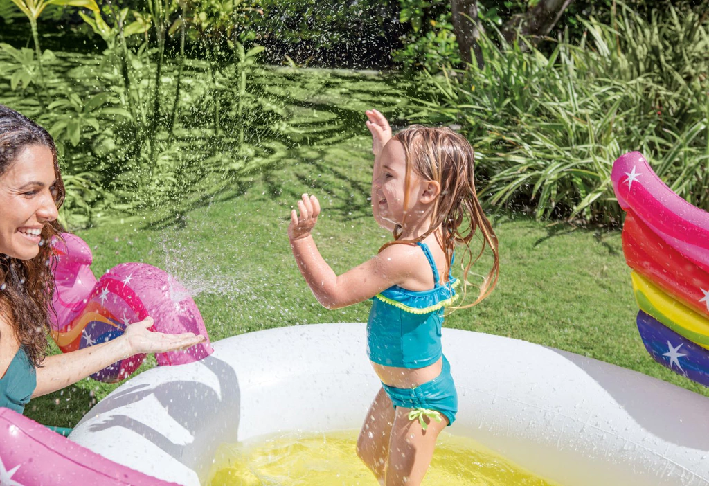 La pileta Inflable infantil Intex con forma de Unicornio contiene un rociador de agua que puede conectarse a una manguera de jardín.