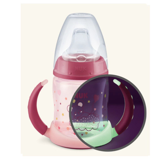 Los elementos brillantes hacen que encontrar el vaso sea muy fácil. Sin despertar a mami o a papi. Sólo coloca el Vaso Aprendizaje NUK con Efecto Luminoso debajo de una lámpara o a la luz del sol. El material especial almacenará la energía y la emitirá como un suave resplandor. Toda la noche. *